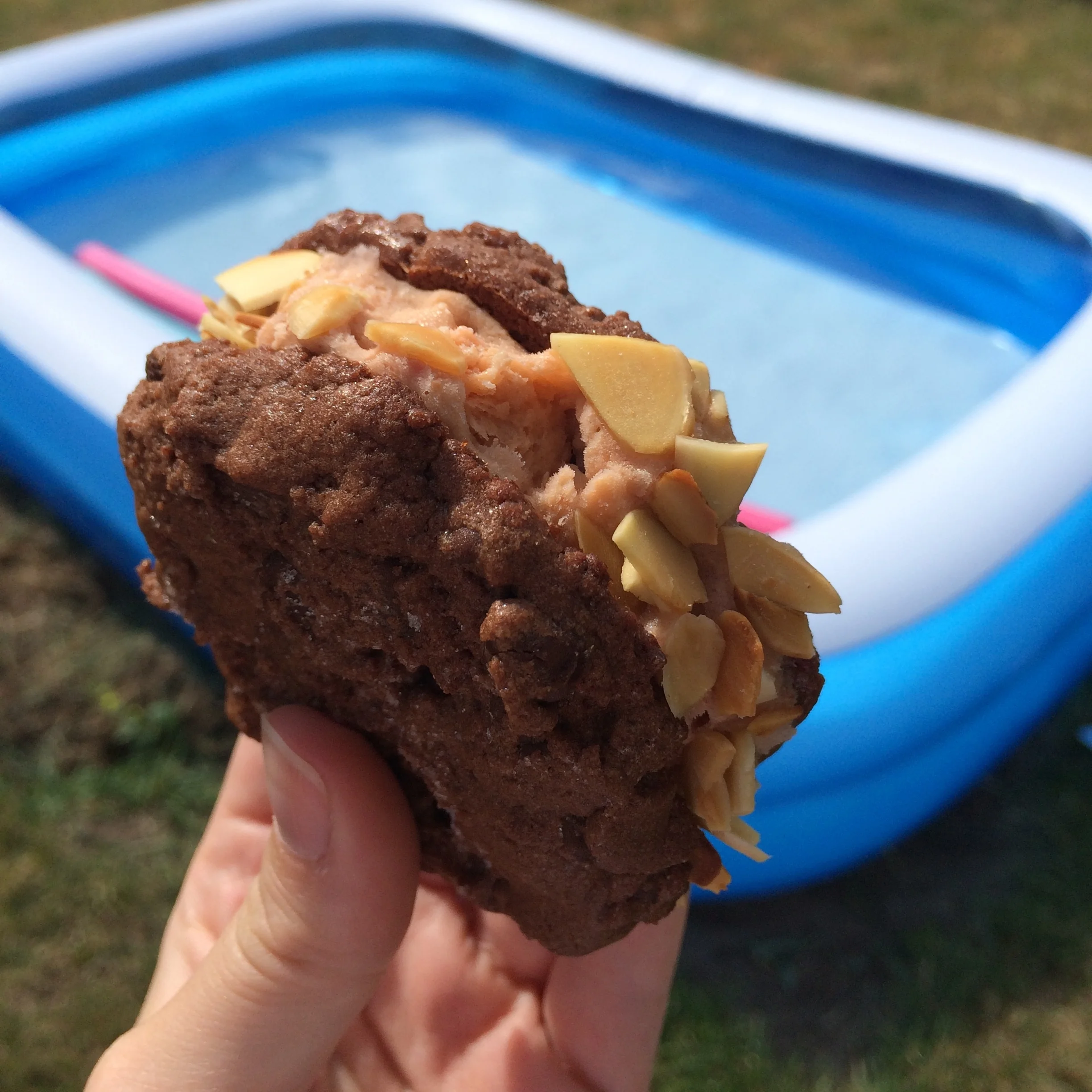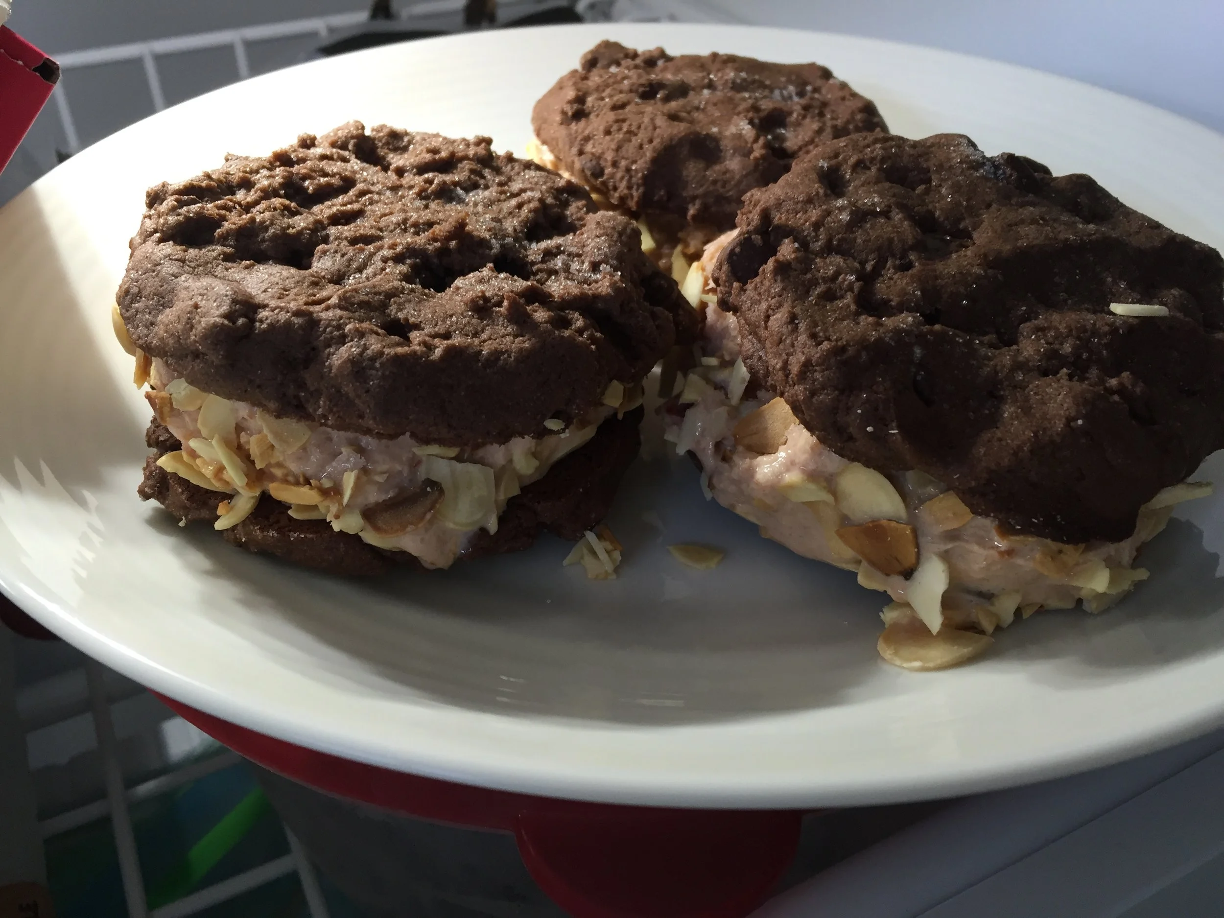 But I couldn't stop at just plain old homemade sour cherry ice-cream. I had to take it one step further because I love to eat. I decided to make ice-cream sandwiches. Playing off the sour cherries I decided to make chocolate chocolate chip cookies (recipe for that, here). Then, I toasted some slivered almonds and rolled the sandwiches accordingly. Let everything freeze overnight, then enjoy! Nom nom nom...
