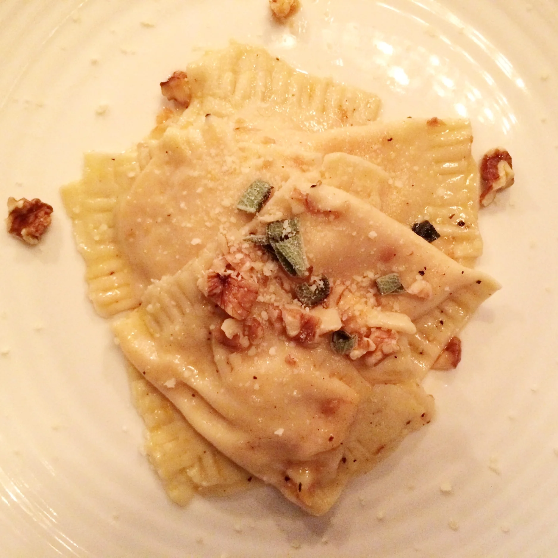 For the sauce, melt butter in a sauce pan over medium heat. Add garlic, Sage, salt and pepper and ravioli to the pan. Add Parmesan cheese and walnuts. Toss well so that everything is covered. Serve and enjoy!